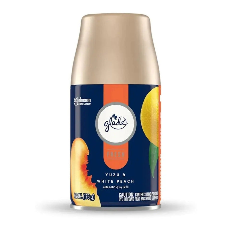 Feel your fresh with Glade Automatic Spray Air Freshener Refills with Peach & Yuzu fresh fragrances. The authentic champagne notes are bubbling with tart yuzu and ruby pink grapefruit and add a bright, celebratory shimmer to a fresh and fun classic. Set it and forget it by choosing between 9, 18 and 36-minute timers for automatic sprays. It's a scent that let's you immediately welcome fresh, fruity feels into your home using multidimensional, artfully layered aromas. Take control to get the vibe you want by either setting the automatic air spray timer or using the boost button for a fragrant spritz anytime. Use Glade automatic spray refills with the Glade automatic spray dispenser.
