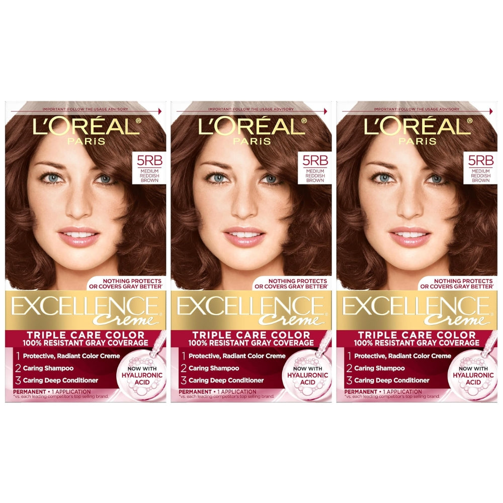 Get rich, radiant color with powerful gray coverage using the L’Oreal Paris Excellence Crème hair color in 5RB Medium Reddish Brown. Designed with a Triple Care Color Routine, this permanent color protects your hair before, during, and after coloring for a smoother, healthier look and feel.