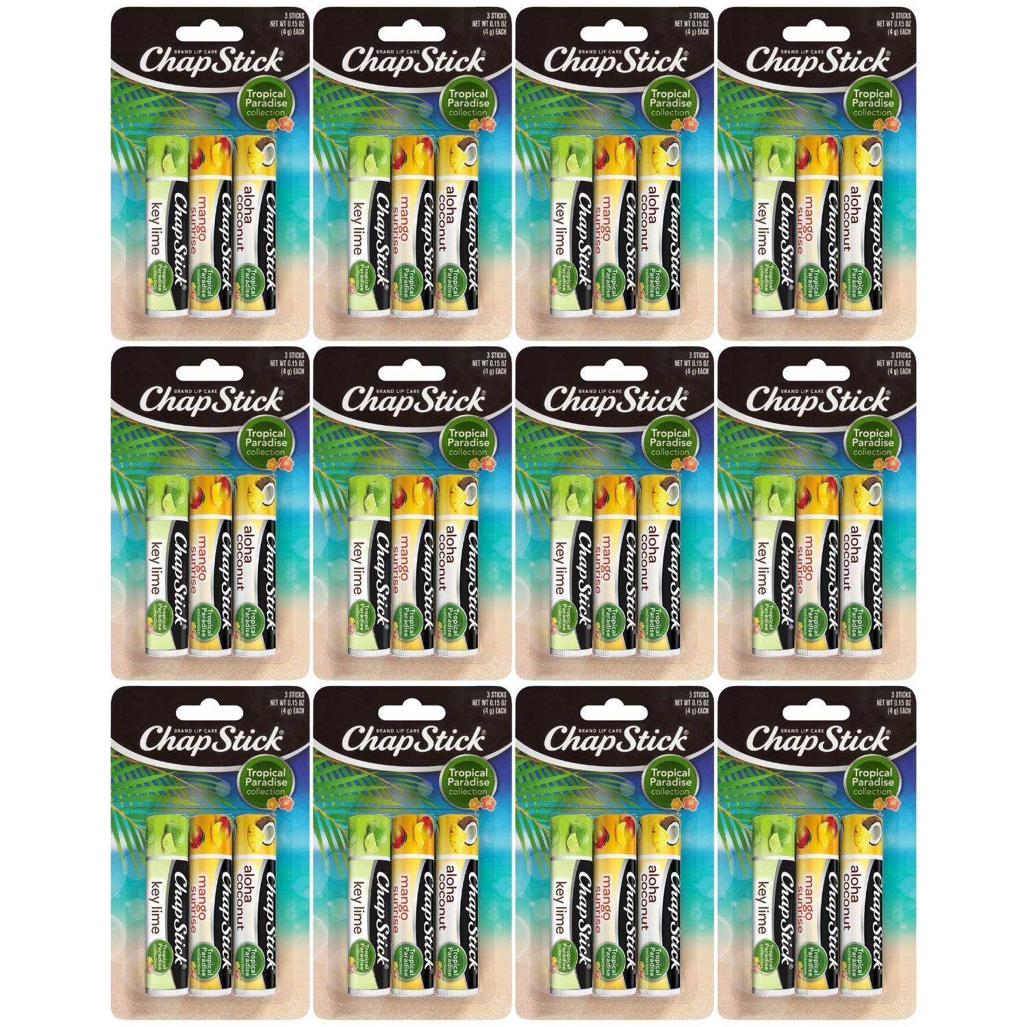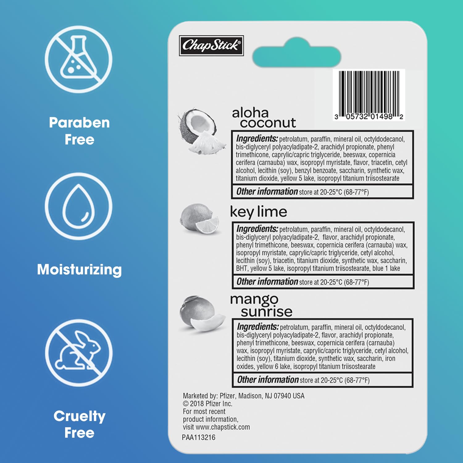 ChapStick Tropical Paradise Collection Mango, Lime and Coconut Lip Balm Tubes Variety Pack moisturizes delicate lips to keep them feeling smooth and wonderfully soft. This Tropical Paradise ChapStick pack comes with three fun, limited edition, collectible flavors: Mango Sunrise ChapStick, Key Lime ChapStick and Aloha Coconut ChapStick. With an amazing aroma and fun design, tropical flavored ChapStick is a sweet and tangy treat your lips won't be able to resist. This ChapStick comes in small, 0.15 ounce tubes that are both super portable and easy to apply throughout the day or whenever your lips are feeling dry. Keep this paraben free, coconut lip balm, key lime lip balm and mango lip balm handy in your pocket, purse or drawer and apply regularly for healthy looking, luscious lips.