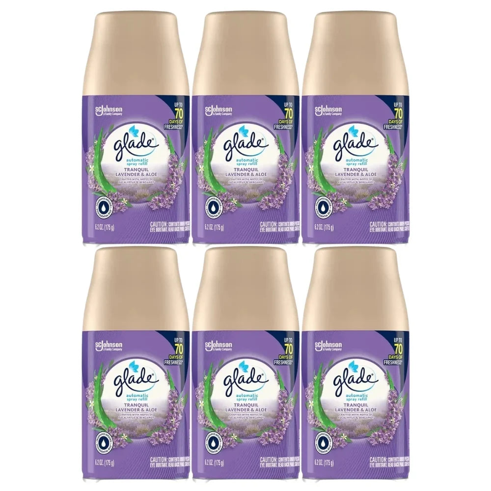 Transform your space into a calming retreat with the Glade Tranquil Lavender & Aloe Automatic Spray Refill. This premium fragrance blends soothing French lavender, gentle aloe, and delicate violet petals to create a peaceful, relaxing atmosphere. Designed for use with Glade Automatic Spray dispensers, it features automatic time-release freshness with customizable settings and a convenient boost function for fragrance whenever you need it. Each refill provides up to 70 days of continuous freshness when used on the 36-minute interval setting.
