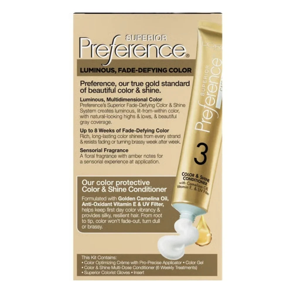 Experience rich, luminous, fade-defying color with L’Oreal Paris Superior Preference in 1 Ultimate Black. Since 1973, Superior Preference has been known as the gold standard in permanent hair color—delivering long-lasting, dimensional color with extraordinary shine.