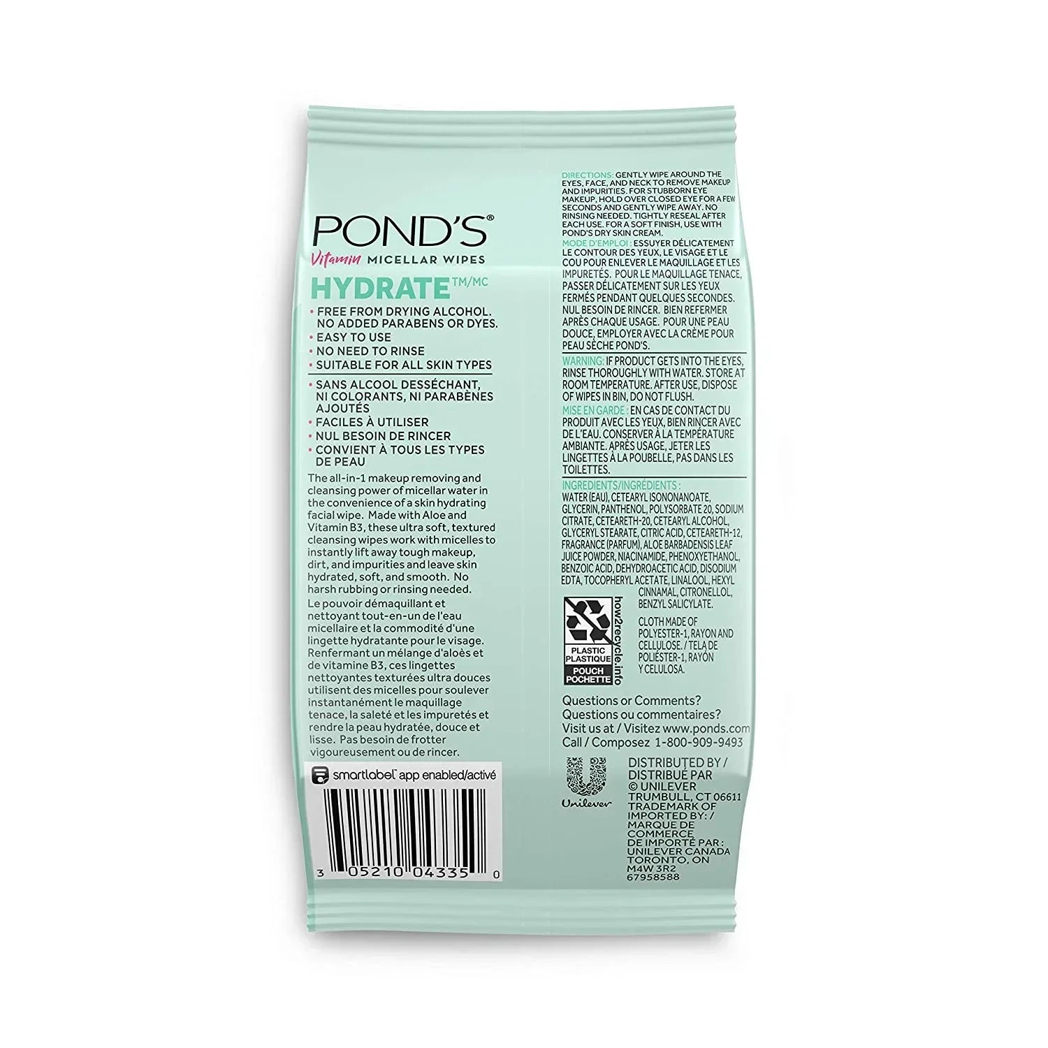 Enjoy the all-in-one cleansing power of micellar water in a soft, hydrating wipe. Pond's Vitamin Micellar Hydrating Aloe Wipes lift away dirt, impurities, and even waterproof makeup without harsh rubbing or rinsing. Infused with aloe and vitamin B3, each wipe refreshes, hydrates, and leaves skin feeling soft and smooth—perfect for daily use or effortless cleansing on the go.