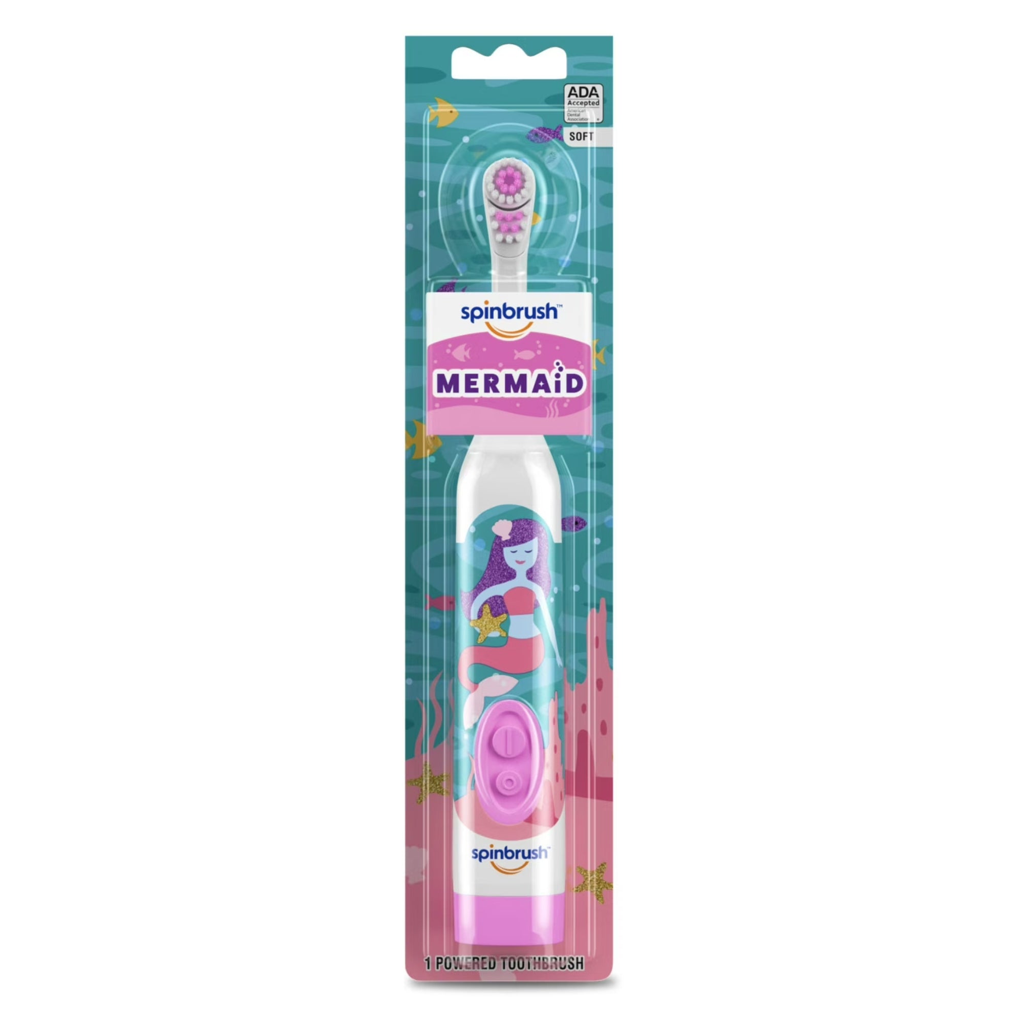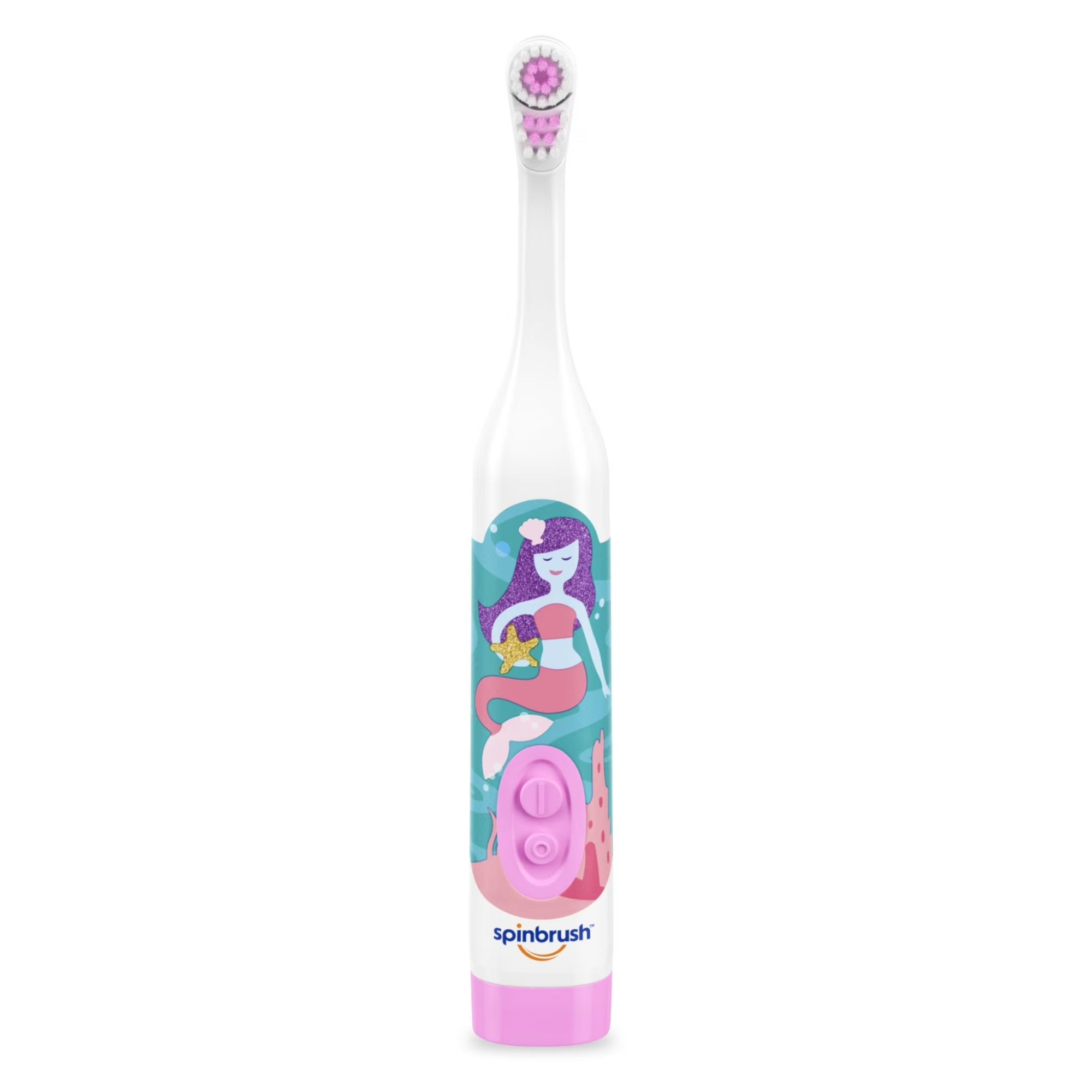 The Spinbrush Kids Battery Powered Soft Bristle Toothbrush, Mermaid Edition, turns everyday brushing into a fun and engaging adventure designed to help children build strong oral care habits. With its cute Mermaid theme and gentle cleaning action, it makes brushing enjoyable while supporting healthy teeth and gums.