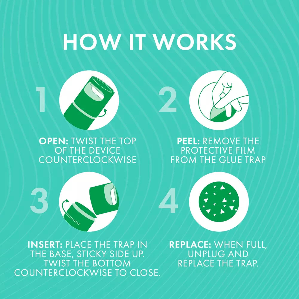 These refills are paired with our portable, dual-technology device that uses UV-light and a fan to attract and trap flying insects in the home. It’s a people and pet friendly (when used as directed) insecticide-free solution that quietly operates in high-traffic spaces. The advanced-touch display allows for customization of the timer and fan speeds, and the refillable glue traps are mess-free for easy use.